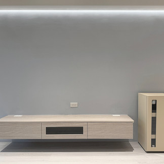 客廳以灰藍色主題牆為視覺焦點,搭配原木色電視櫃,溫潤木紋襯托出雅致氛圍。考量屋主希望神明桌能融入整體風格而不顯突兀,設計團隊將神桌整合於淺色櫃體中,配置抽盤平台與抽屜收納,既保留傳統祭拜的需求,也實現現代美學與傳統信仰的和諧共存,創造出獨特的當代居家風格。